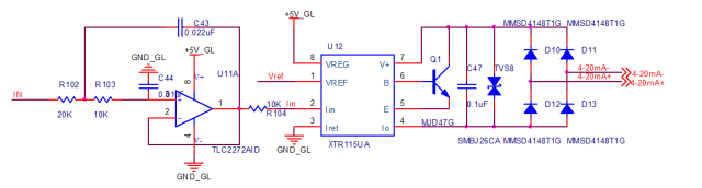 上述电路是一个整流电路,将输入的一定频率的脉冲整流成固定的电平电压,再用此电压控制4-20mA电流的输出电流。该电路功能类似一些DAC功能的接口。