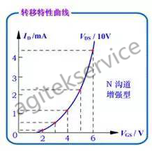 转移特性曲线的斜率gm的大小反映了栅源电压对漏极电流的控制作用。gm的量纲为mA/V,所以gm也称为跨导。