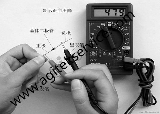 数字万用表可以测量发光二极管,整流二极管……测量时,表笔位置与电压测量一样,将旋钮旋到“”档;用红表笔接二极管的正极,黑表笔接负极,这时会显示二极管的正向压降。肖特基二极管的压降是0.2V左右,普通硅整流管(1N4000、1N5400系列等)约为0.7V,发光二极管约为1.8~2.3V。调换表笔,显示屏显示“1.”则为正常,因为二极管的反向电阻很大,否则此管已被击穿。
