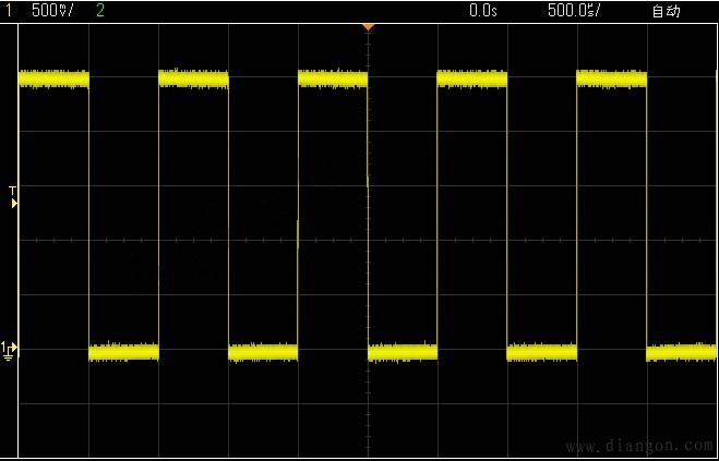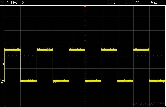 如上图,在每个通道插座上方的旋钮,就是调整该通道的幅值的,即波形垂直方向大小的调整。转动它们,就可以改变示波器屏幕上每个竖格所代表的电压值,所以可称其为“伏格”调整,如以下两幅对比图所示:左图是1V/grid,右图是500mV/grid,左图波形的幅值占了2.5个格,所以是2.5V,右图波形的幅值占了5个格,也是2.5V。推荐是将波形调整到右图这个样子,因为此时波形占了整个测量范围的较大空间,可以提高波形测量的精度,如图3所示。
