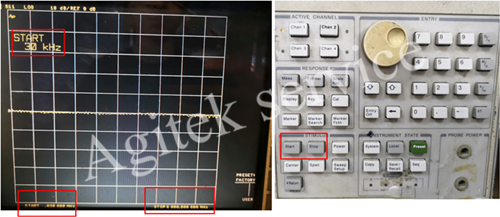 首先橙子视频下载进行校准前的参数设置。通过按键板的【Start】和【Stop】按键来设置起始和终止频率,比如30kHz~6GHz,设置完成屏幕的底部会显示。