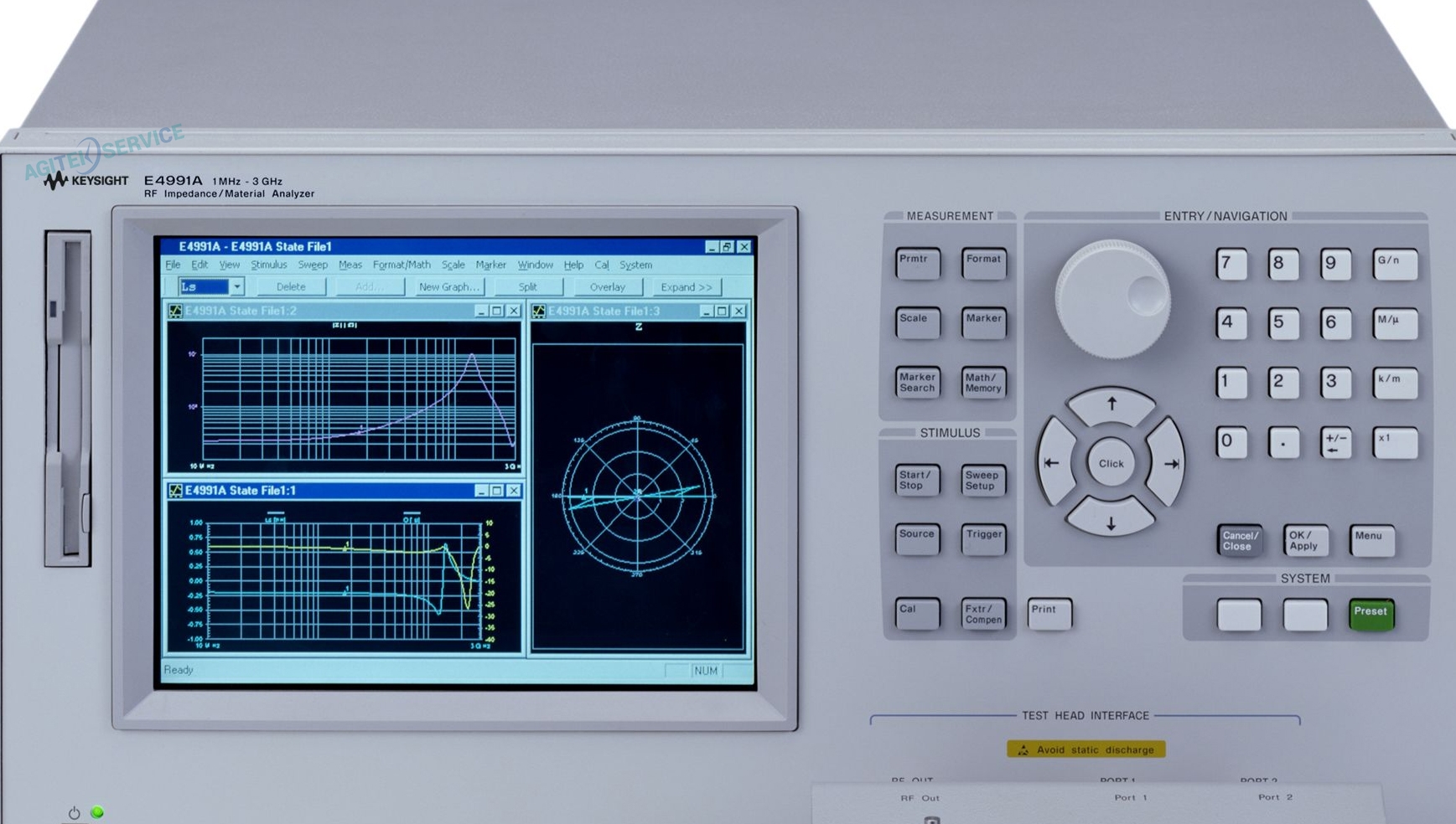 E4991A 射频阻抗/材料分析提供极限阻抗测量性能和功能强大的内置分析功能。它将为元器件和电路设计人员测量 3 GHz 以内的元器件提供创新功能,帮助他们进行研发工作。与反射测量技术不同,E4991A 使用射频电流–电压(RF-IV)技术,可在广泛的阻抗范围内提供更精确的阻抗测量结果。基本阻抗精度是 +/-0.8%。高 Q 精度有利于进行低功耗元器件分析。内置合成器具有 1 MHz到 3 GHz 的扫描范围和 1 mHz的分辨率。