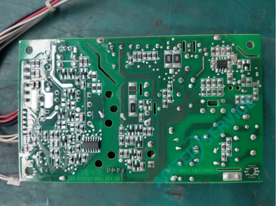 开机测试,上电自动开机,开机半分钟左右黑屏,用功率计检测,开机瞬间功率50W,黑屏瞬间功率掉到1W。由此判断为电源故障,拆机检测。确定为主电源模块问题。