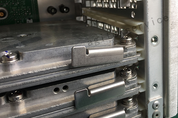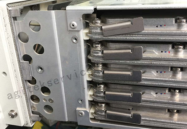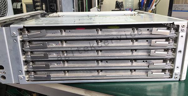 三、测试与判断:经检测,机器似乎摔过,侧面5块板子(A13,14,15,16,18)移位,导轨脱落,系统无法启动,CPU板损坏,合成板也损坏了。