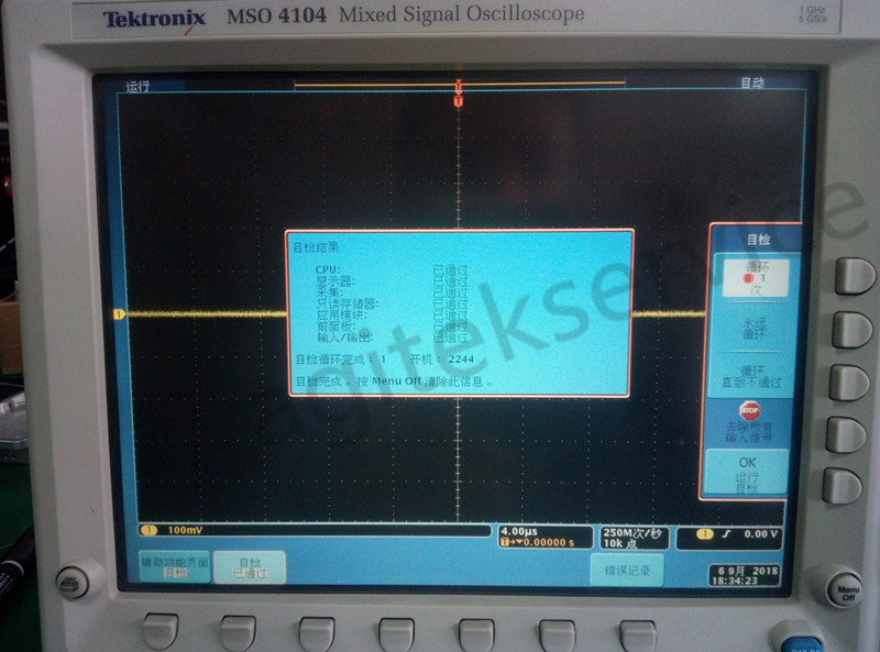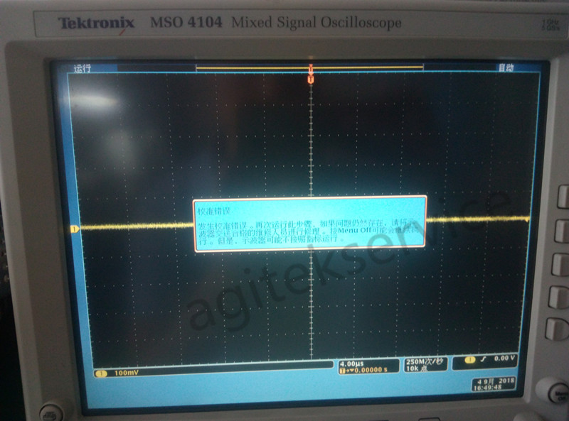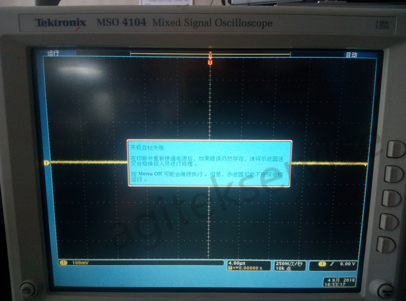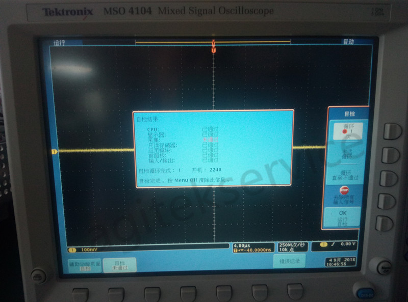 近期有客户送修一台MSO4104B,客户反馈仪器按键失灵,自检无法通过,自检采集报错,无法正常进入测试界面。根据客户描述故障现象,工程师拿到仪器后首先通电开机检测,正常通电后出现以下故障现象: