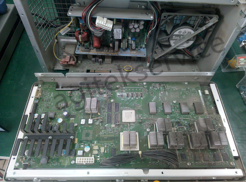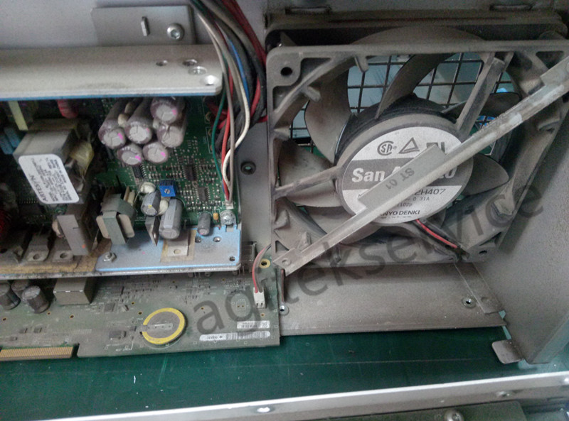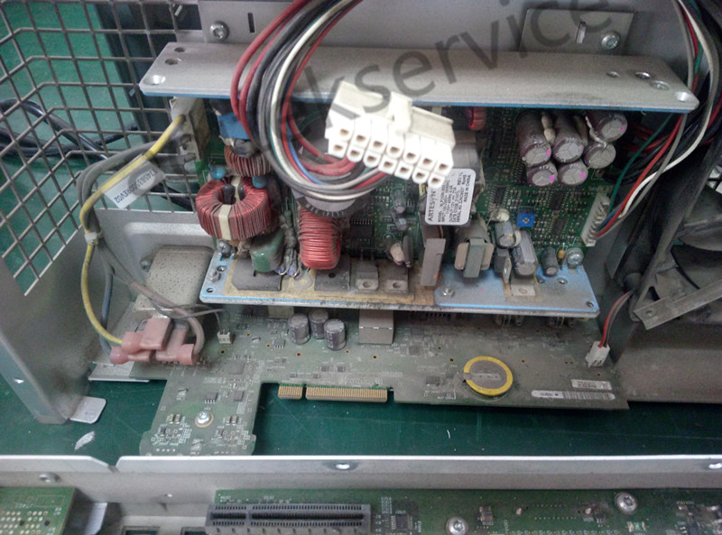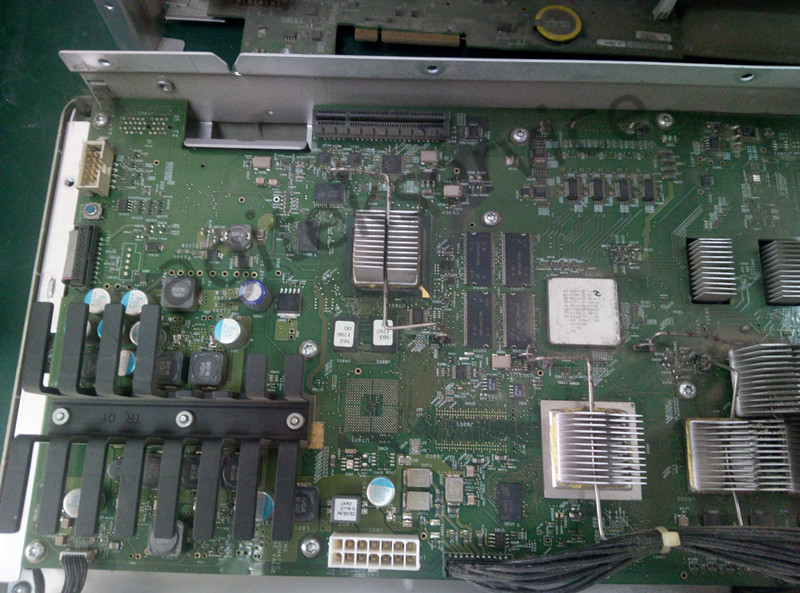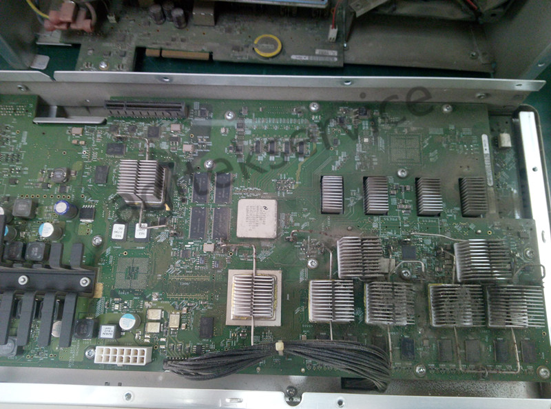 首先打开仪器后盖看看内部情况,看看图中仪器主板采集板各个组件上门落了厚厚一层灰:(仪器长时间暴露在不良好的环境中,久而久之就会积灰,这种情况也是仪器故障频发的一个导火索,因此定期也是要对仪器进行除尘的。)