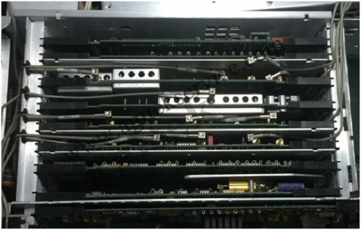 c) 将A4至A12板逐块取下后再开机,发现将A5板取下后设备可以开机,前面板指示灯亮,风扇转动。故初步判定为A5时钟信号板故障导致设备不开机。