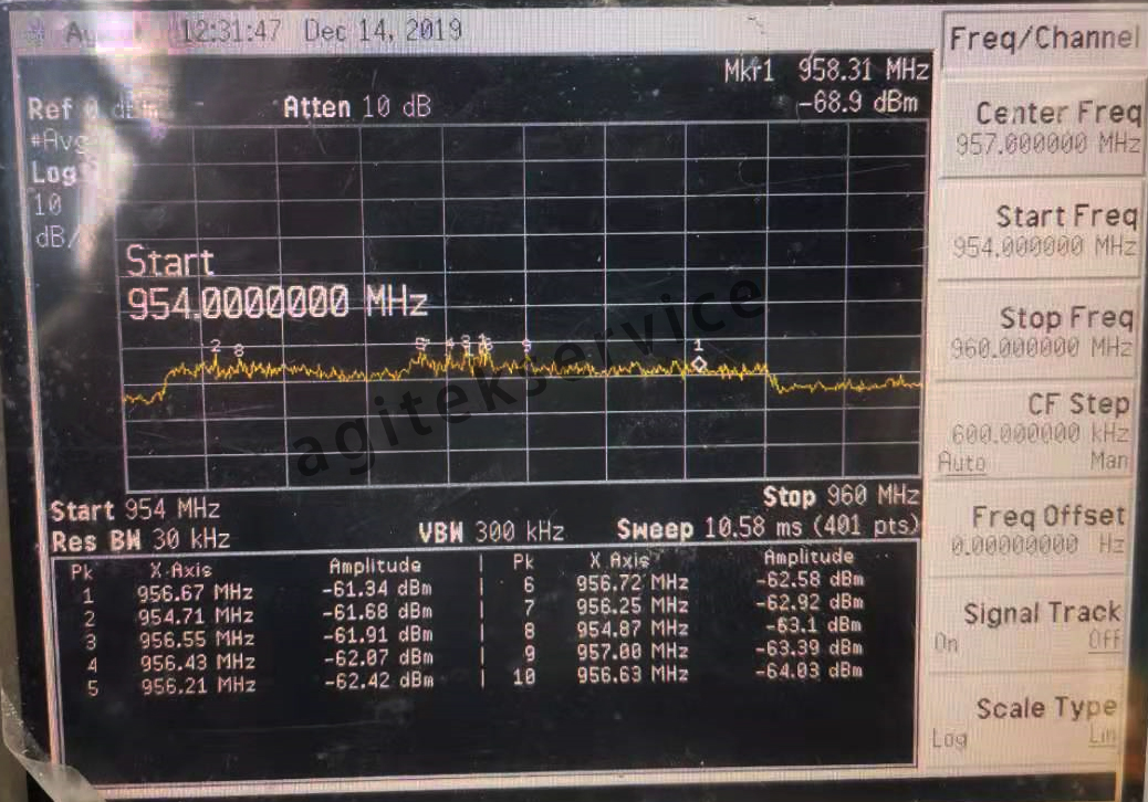 联通2G下行频段:954MHz-960MHz底部峰值搜索表信号功率最大为-61.34dBm