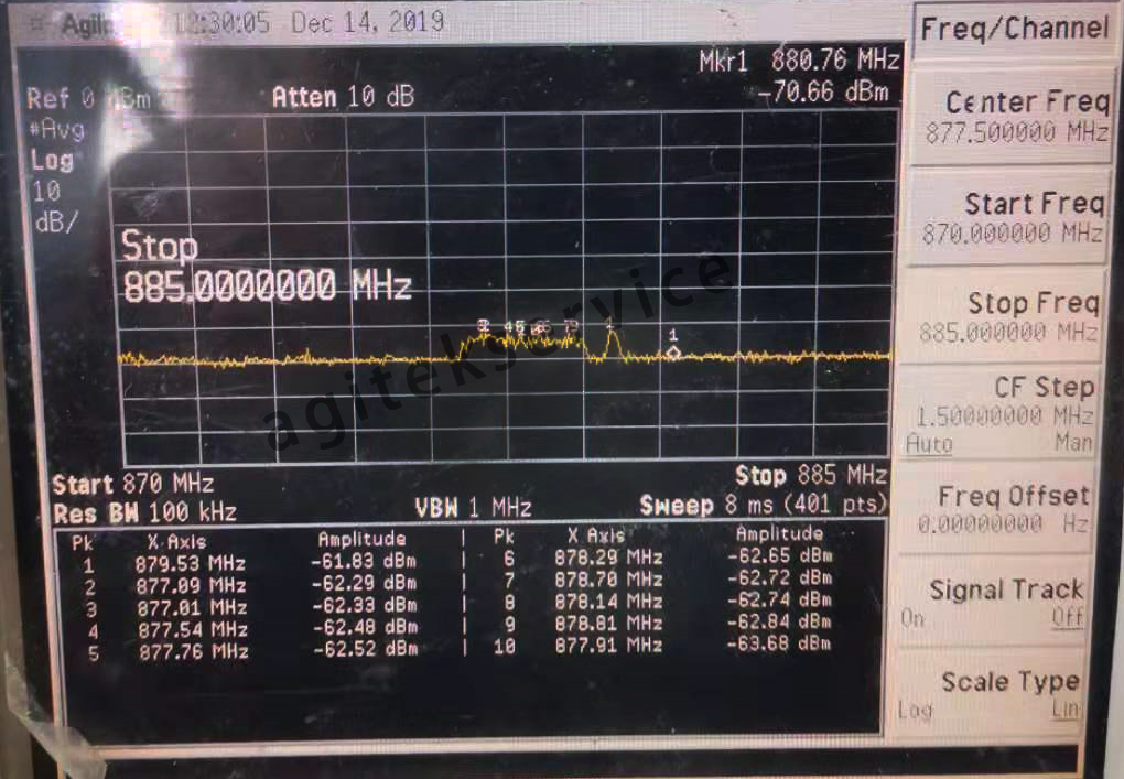 电信2G下行频段:870MHz-885MHz底部峰值搜索表信号功率最大为-61.83dBm